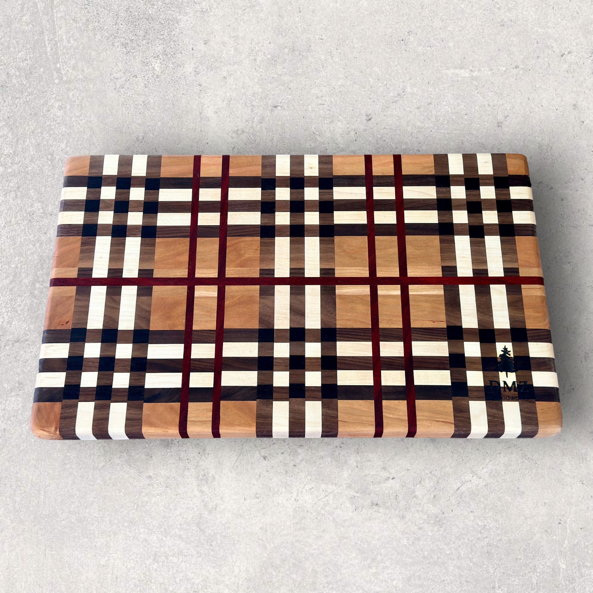 Beautifully designed handmade cutting board made out of the finest domestic and exotic hardwoods. The board includes cherry, maple, walnut, wenge and paduak to create the tartan pattern.